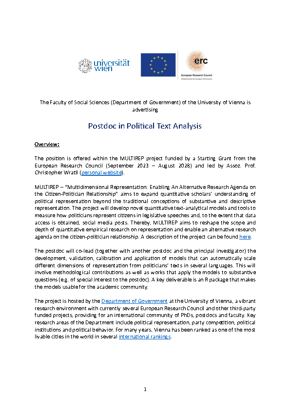 Assoz. Prof. Christopher Wratil is looking for a Postdoc in Political Text Analysis within the MULTIREP project:
