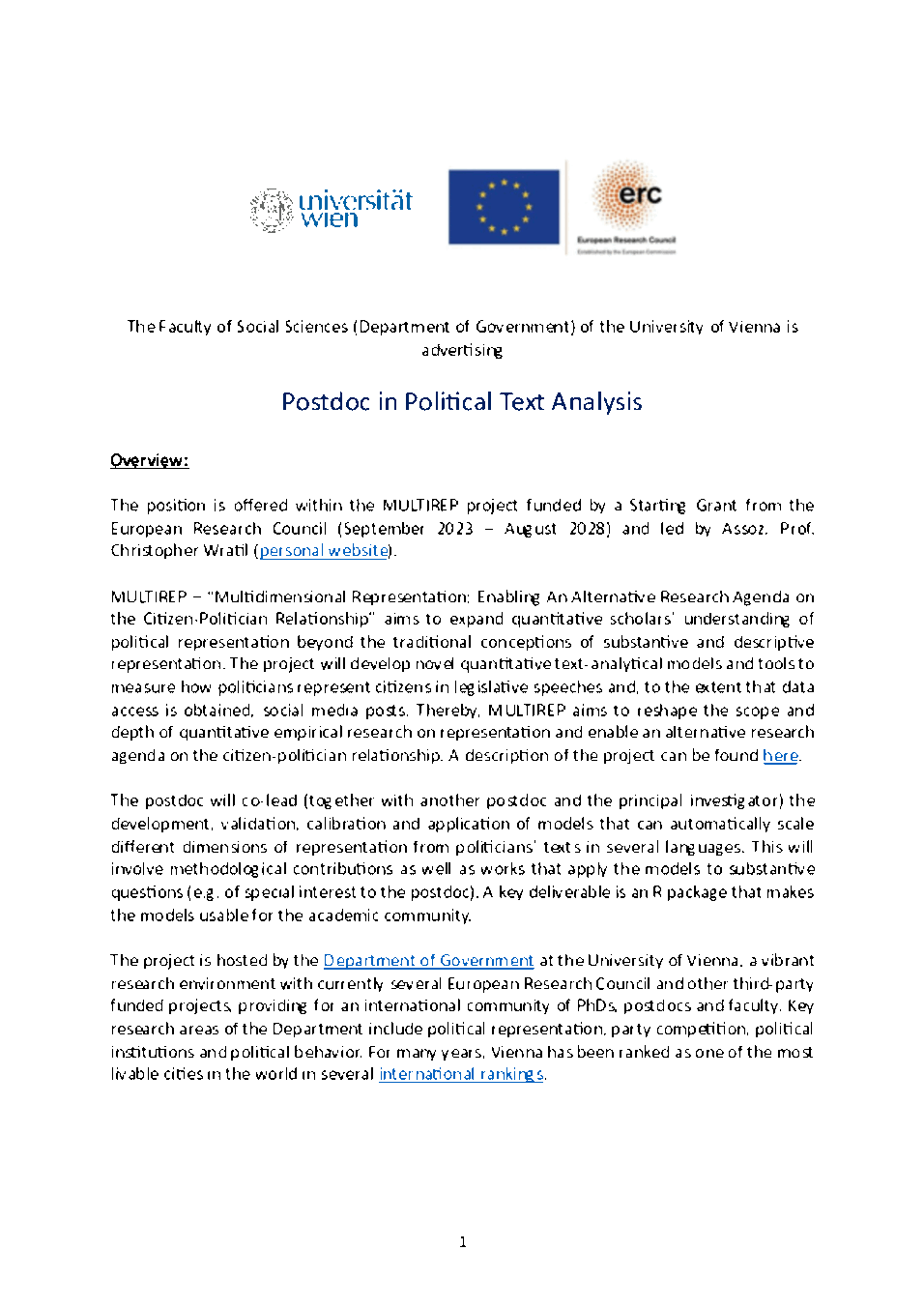 - Publish methodological and substantive research on politicians’ representation styles (together with other team members), aiming for manuscript placements in leading political science outlets